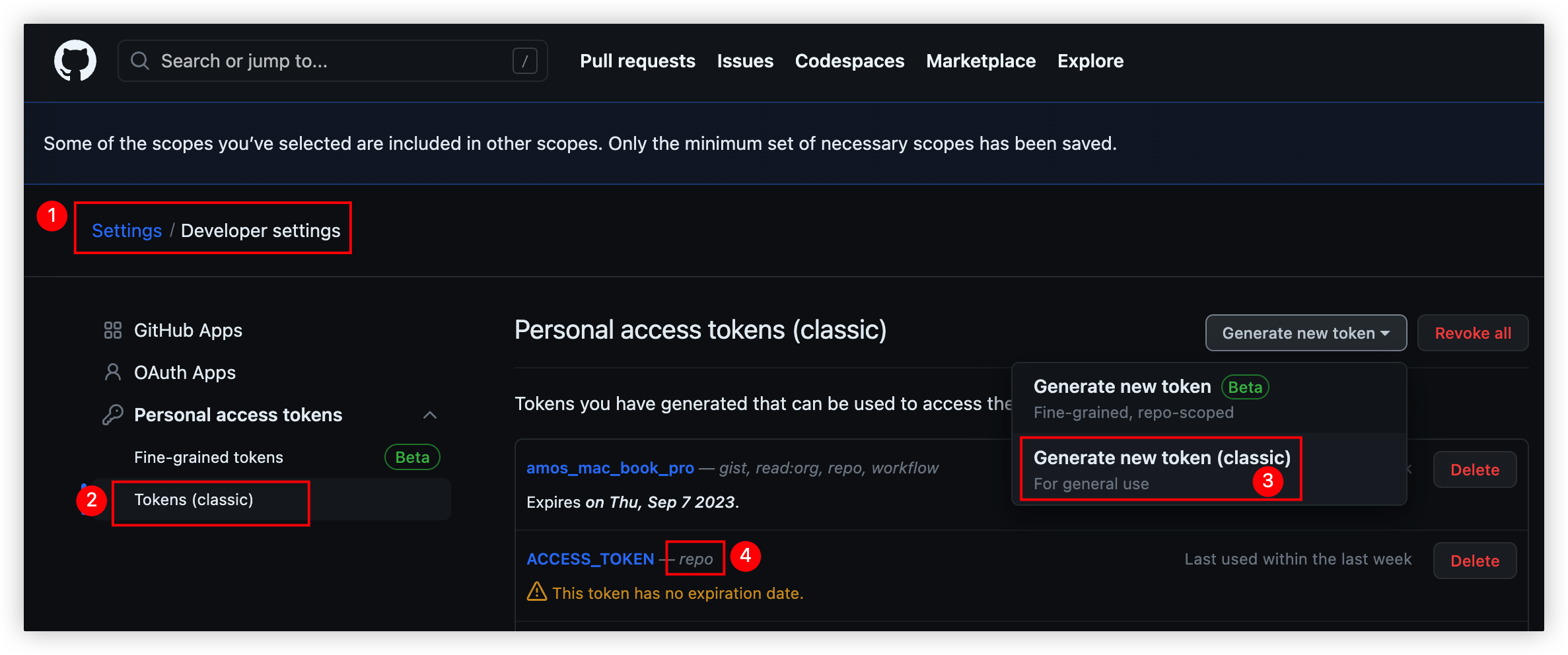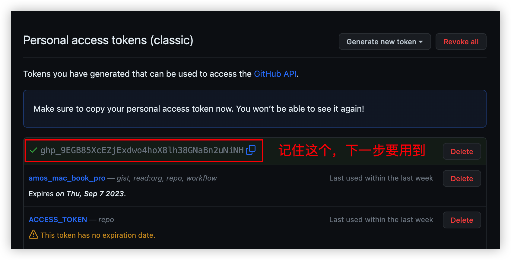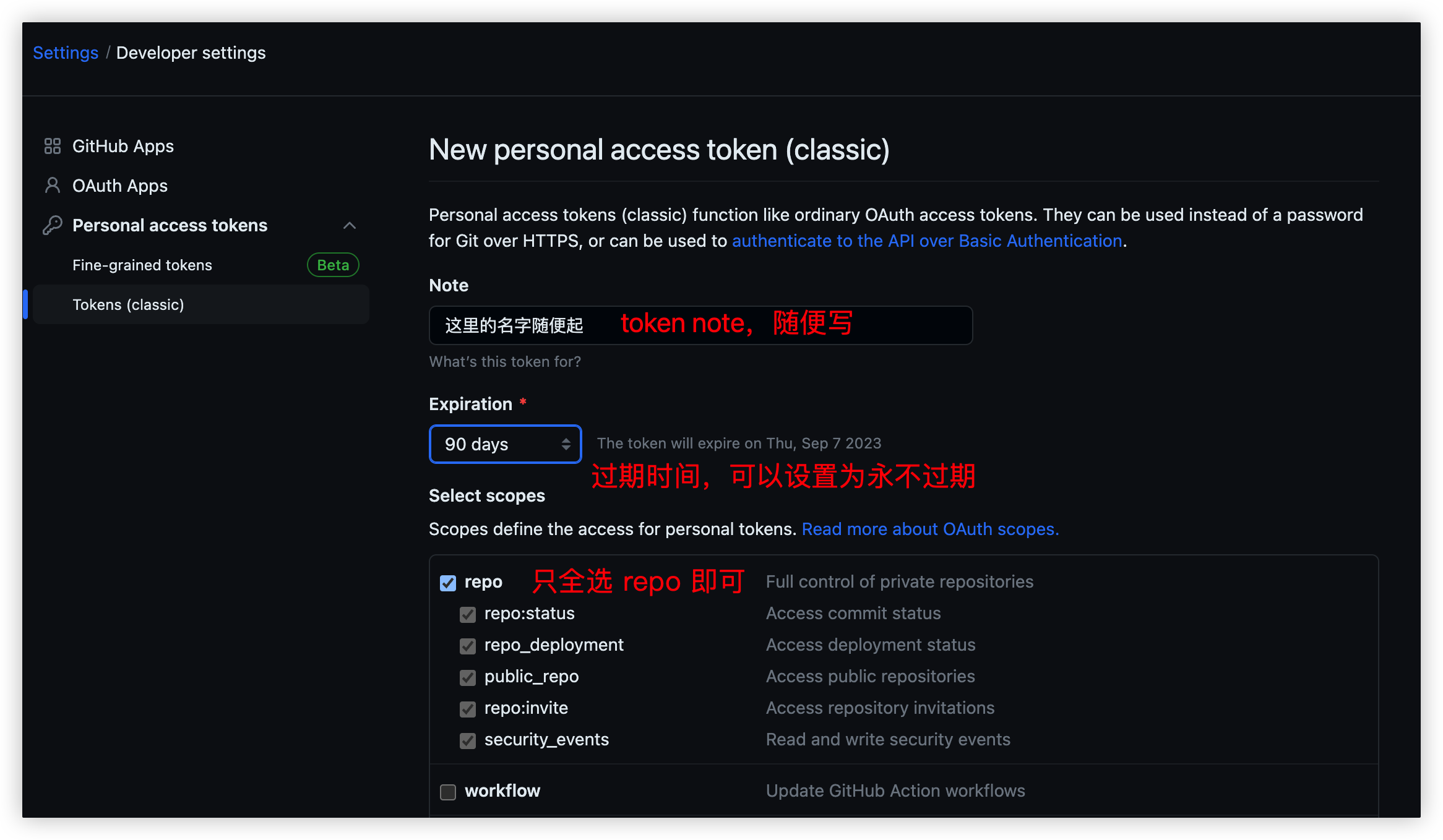 - 创建个人维度的 Github Token(后边自动化部署 push 代码需要)