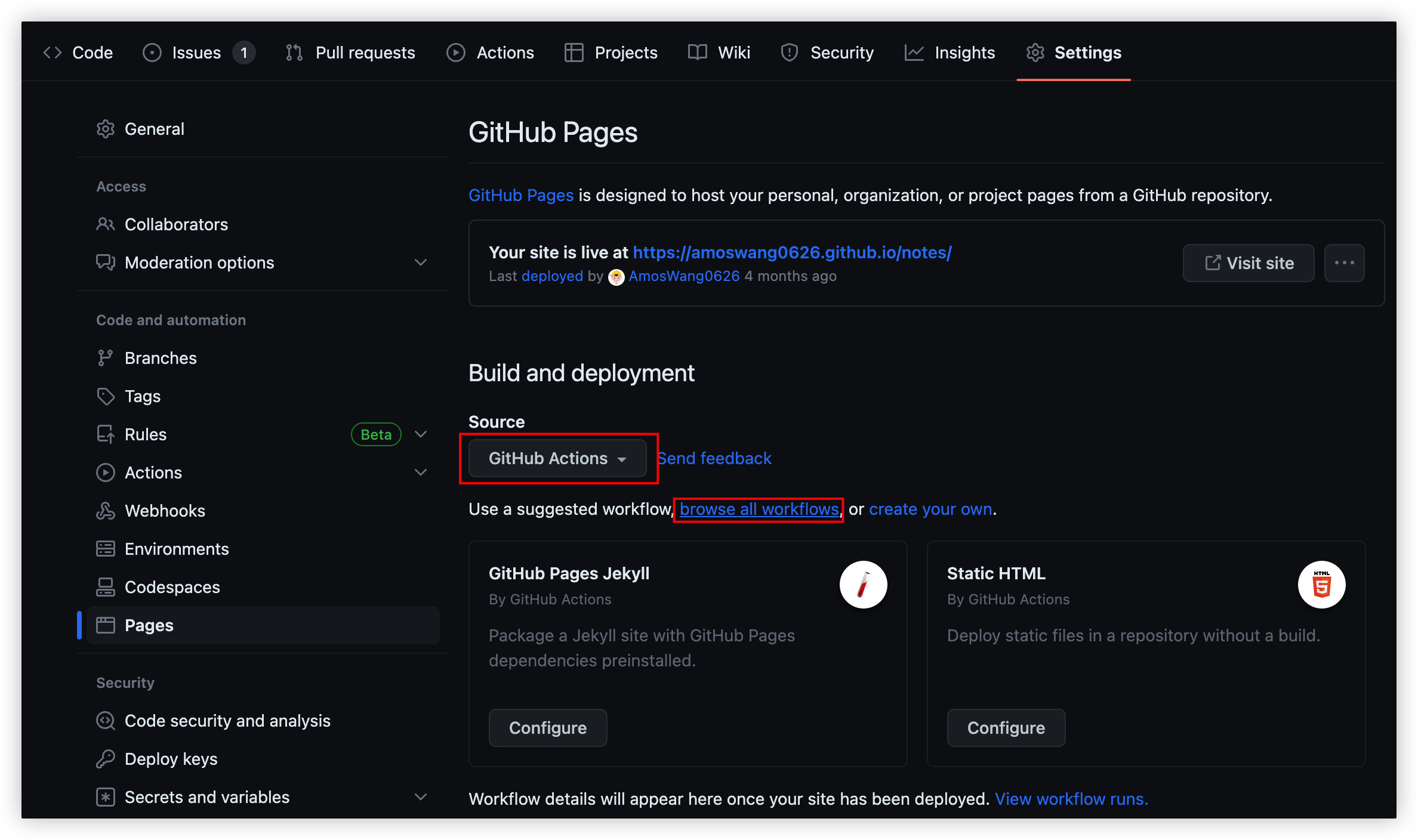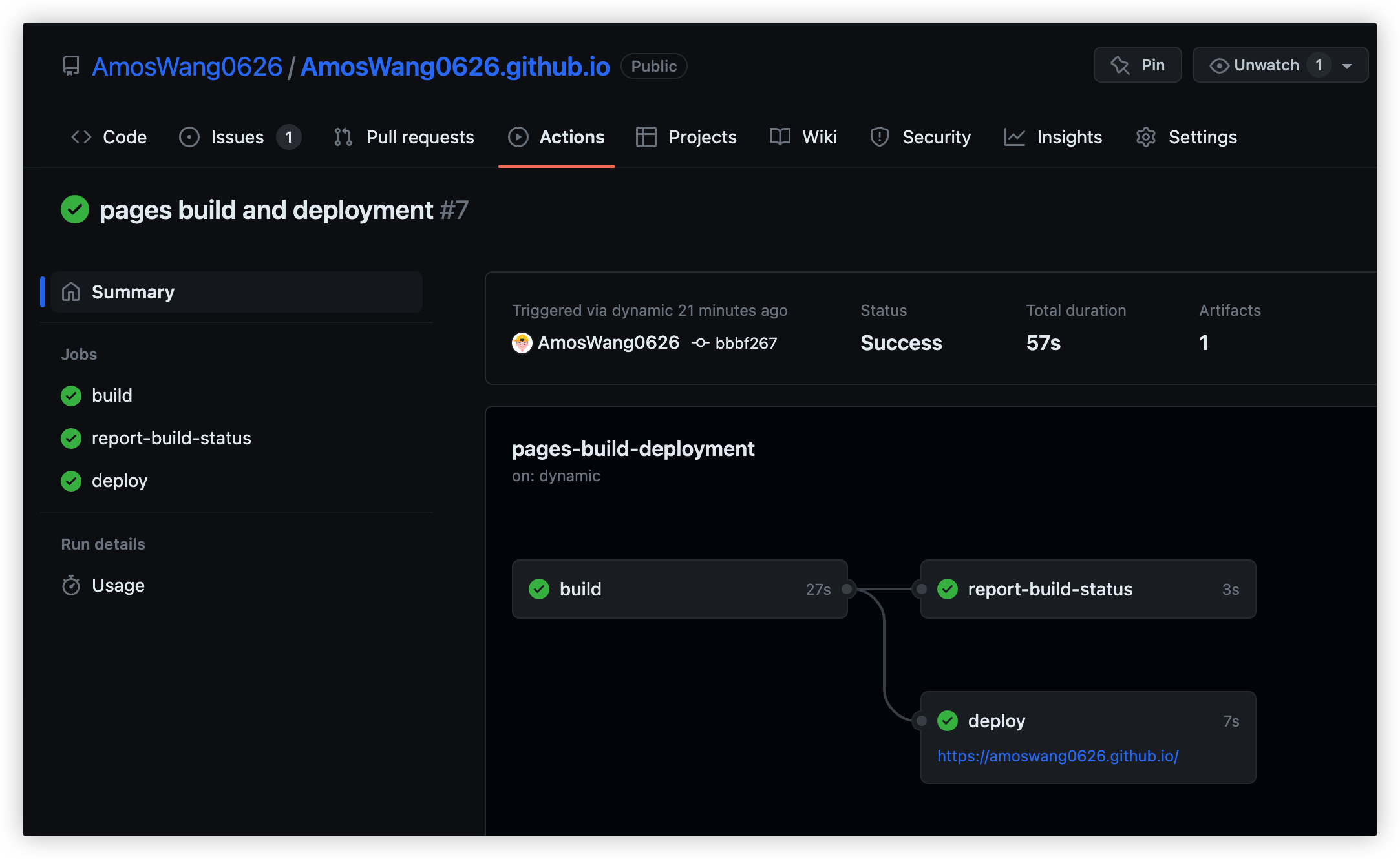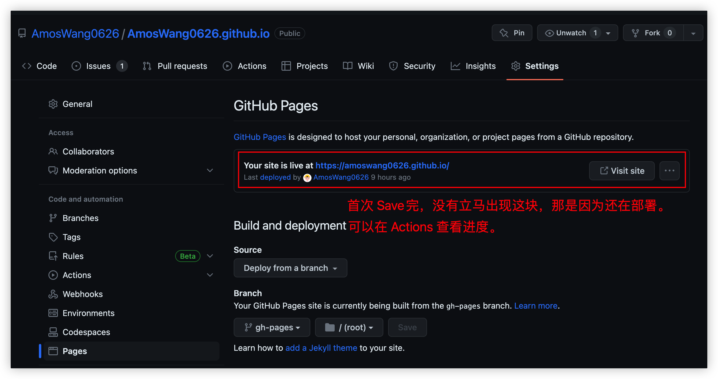 进入 Actions 查看进度,等 deploy 完成就能访问了。