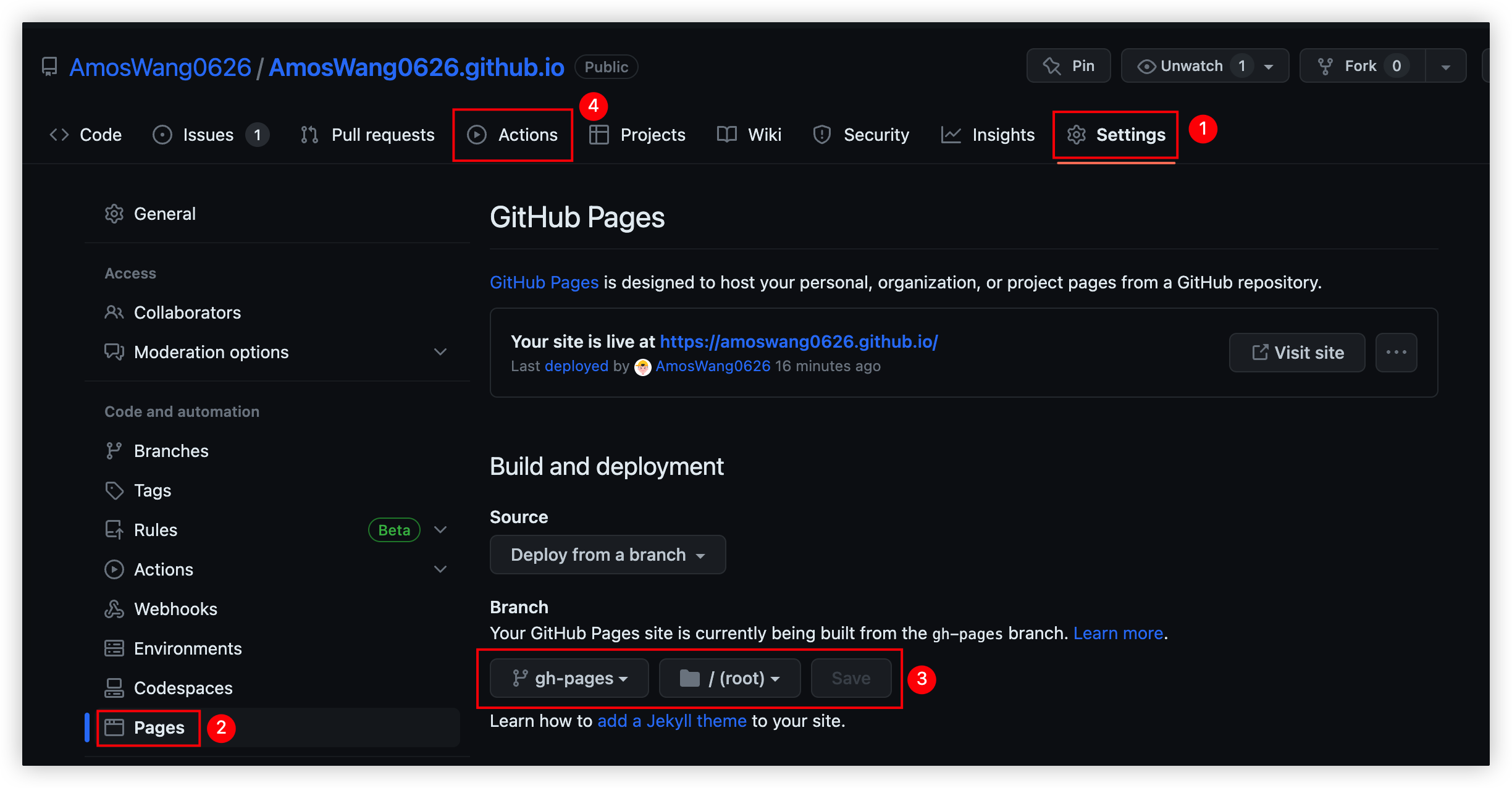 - 打包发布完成,切换到 gh-pages 分支,等站点自动化部署完,就能访问啦~